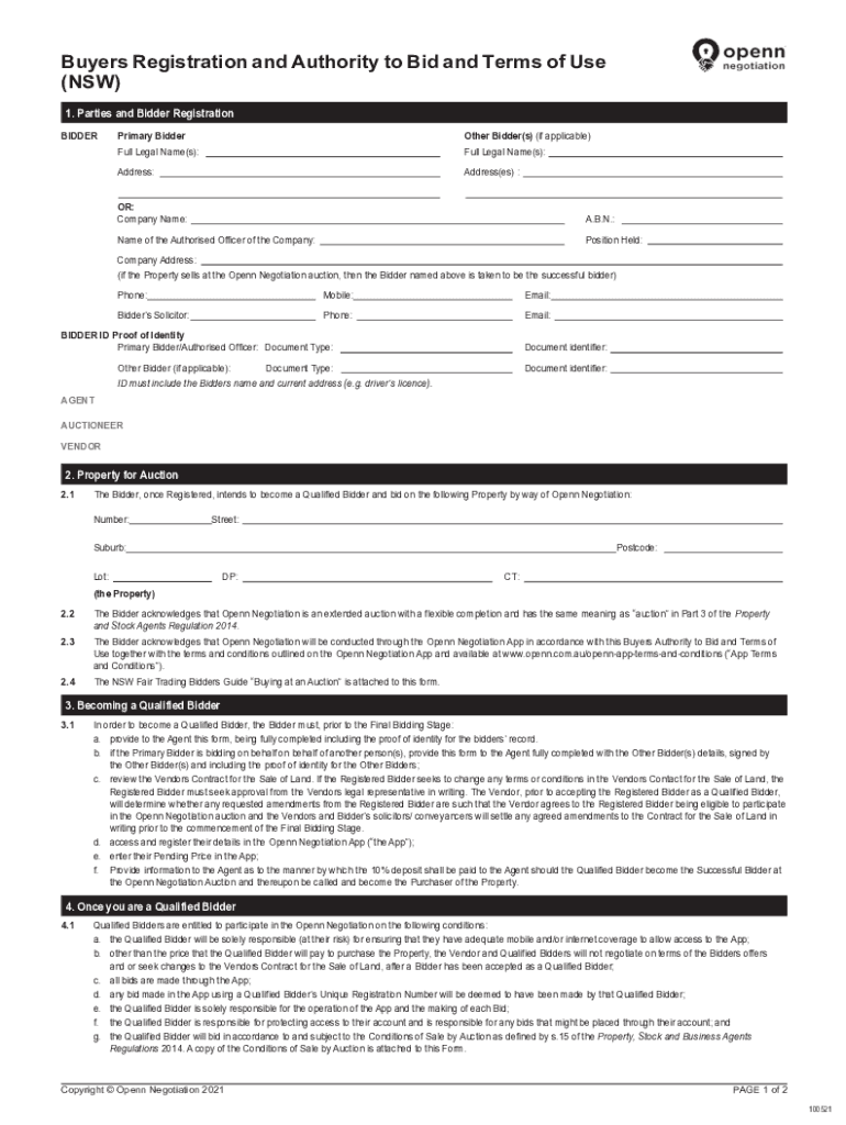 Buyers Registration and Authority to Bid and Terms of Use (NSW) 1. Parties and Bidder Registration BIDDERPrimary BidderOther Bidder(s) (if applicable)Full Legal Name(s):Full Legal Name(s):Address:Address(BS)