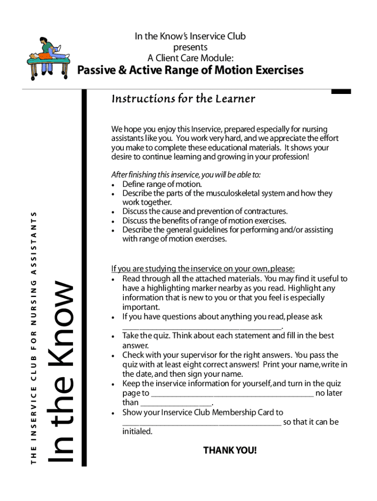 In the Knows In service Club presents A Client Care Module:Passive & Active Range of Motion ExercisesInstructions for the LearnerAfter finishing this in service, you will be able to: Define range