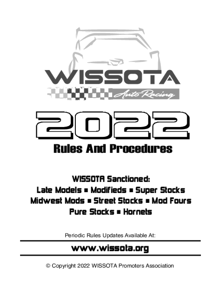 2022 Rules And ProceduresWISSOTA Sanctioned: Late Models Modified Super Stocks Midwest Mods Street Stocks Mod Fours Pure Stocks Hornets Periodic Rules Updates Available At:www.wissota.org Copyright