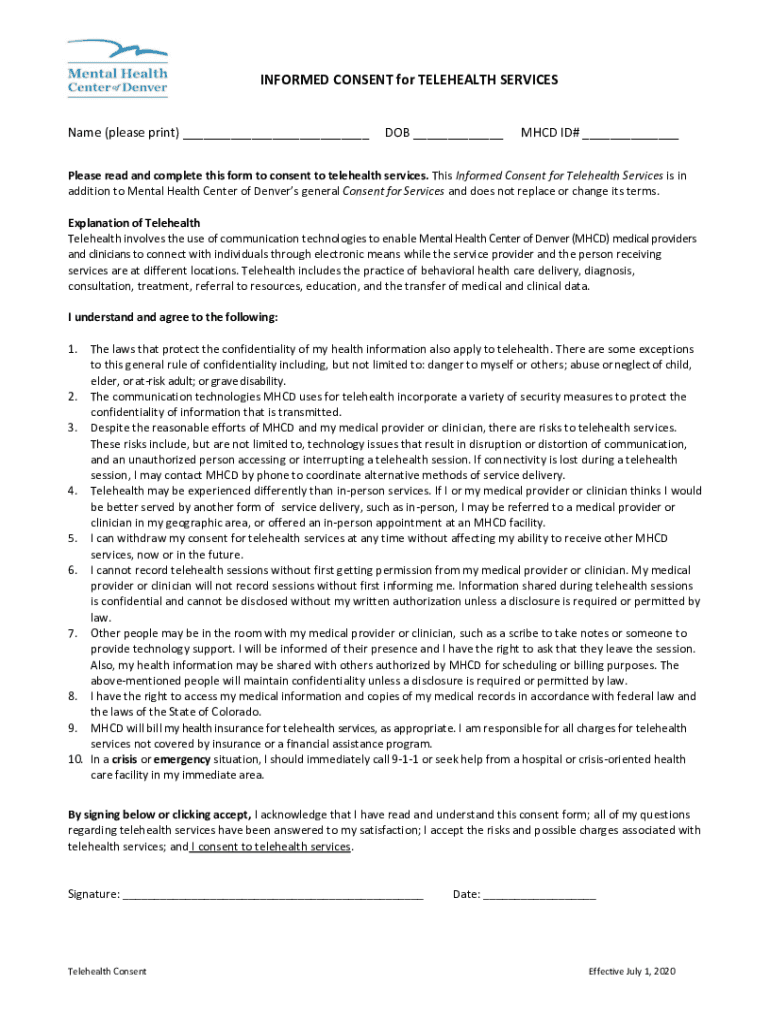 Get the free PDF Mental Health Center of Denver Consent for TeleHealth Services
