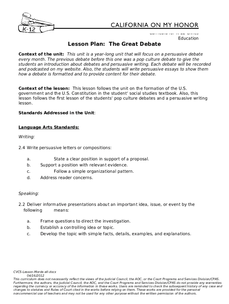 Instructions for the The Great Debate: U.S. Supreme Court Cases - civicseducation - California form