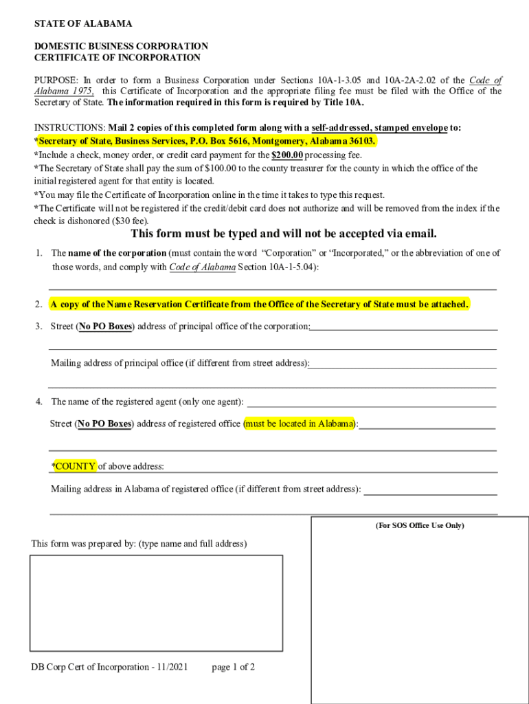 STATE OF ALABAMA DOMESTIC BUSINESS CORPORATION CERTIFICATE OF INCORPORATION PURPOSE: In order to form a Business Corporation under Sections 10A13.05 and 10A2A2.02 of the Code of Alabama 1975, this
