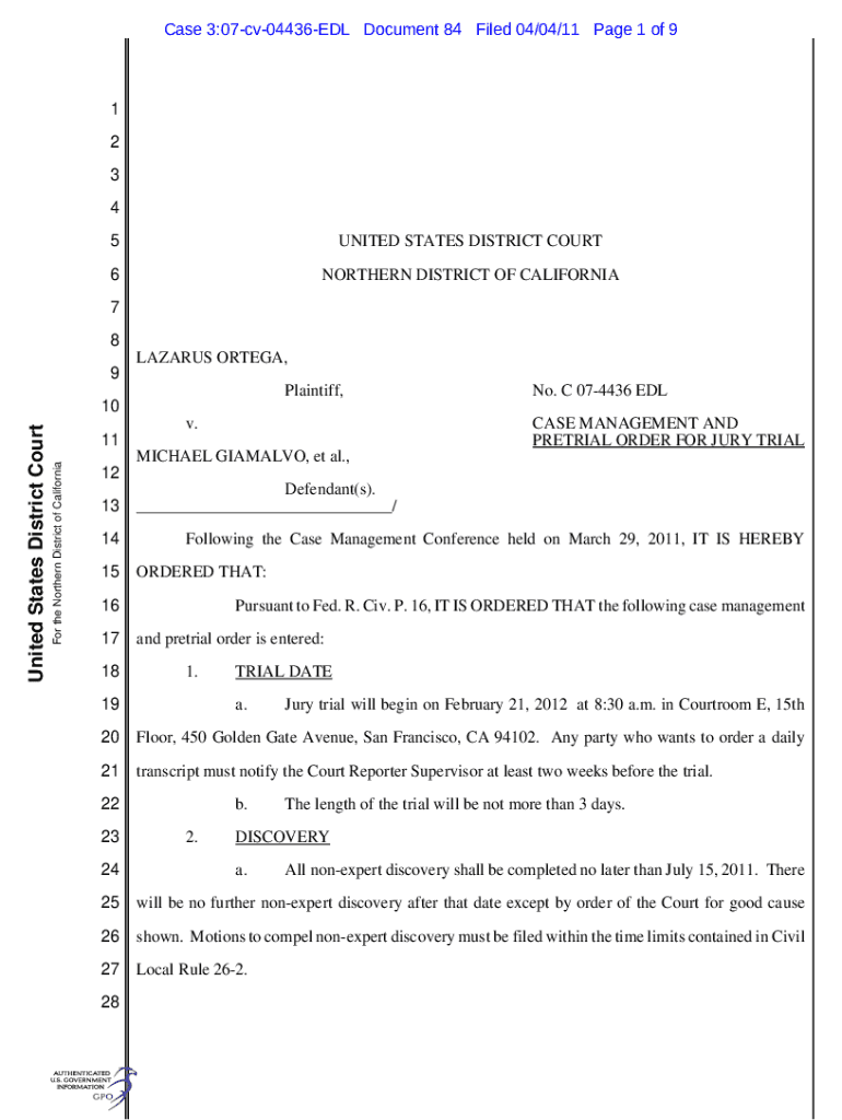 Case 3:07cv04436EDL Document 84 Filed 04/04/11-Page 1 of 91 2 3 4 5UNITED STATES DISTRICT COURT6NORTHERN DISTRICT OF CALIFORNIA7 8 LAZARUS ORTEGA, 9 Plaintiff, No. C 074436 EDL. CASE MANAGEMENT AND