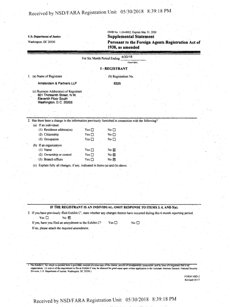 Received by NSW/FAR Registration Unit 05/30/2018 8:39:18 PM OMB No. 11240002: Expires May 31.2020Supplemental Statement Pursuant to the Foreign Agents Registration Act of 1938, as amended. S. Department