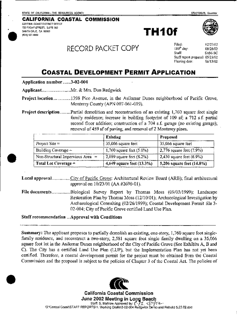 GRAYOAVIS. Governorate OF CALIFORNIA THE RESOURCES AGENCYCALIFORNIA COASTAL COMMISSIONCENTRAL COAST DISTRICT OFFICE 725 FRONT STREET, SUITE 300 SANTA CRUZ. CA 95060TH10f(831) 4274863Filed: 02/27/02