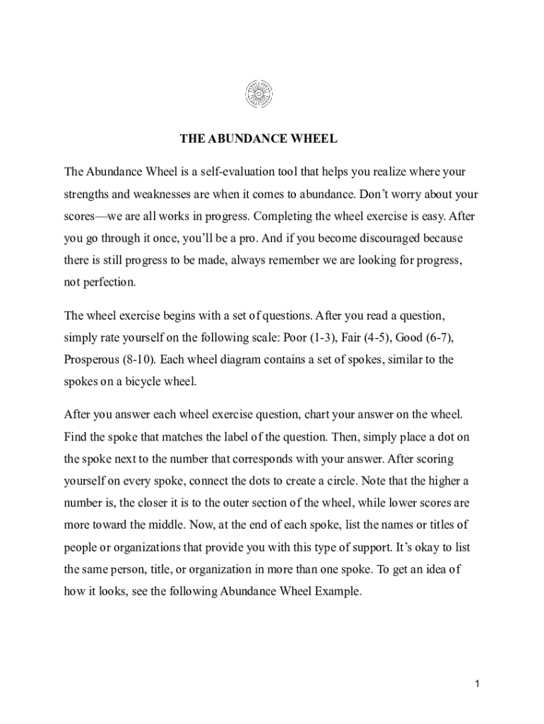 THE ABUNDANCE WHEEL The Abundance Wheel is a self evaluation tool that helps you realize where your strengths and weaknesses are when it comes to abundance. Don't worry about your scores we are all