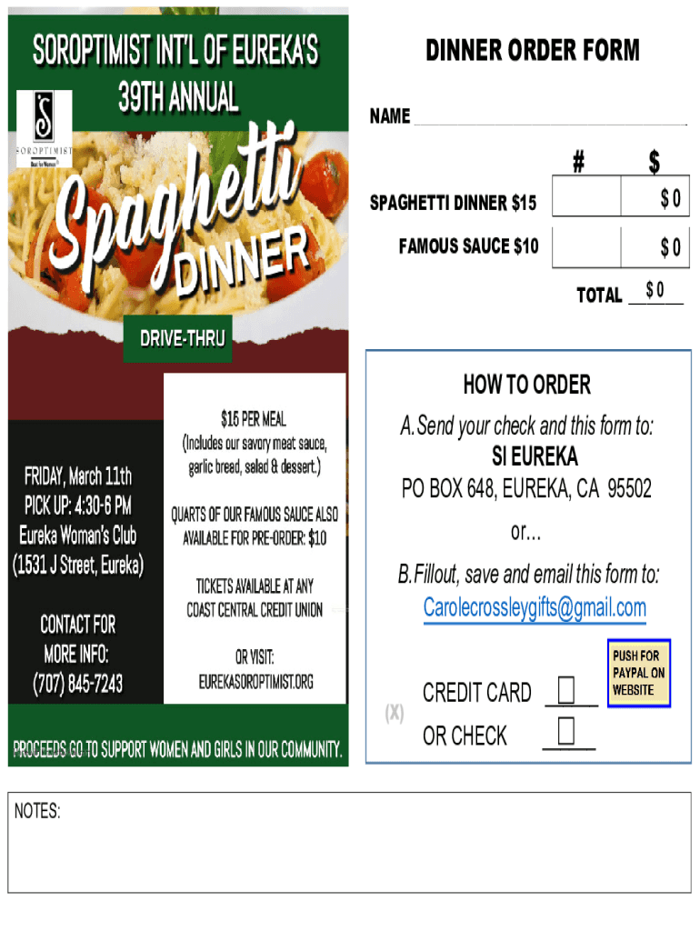 DINNER ORDER FORM NAME ___#SPAGHETTI DINNER $$150FAMOUS SAUCE $$$1000 TOTAL ___HOW TO ORDER A. Send your check and this form to: SI EUREKA PO BOX 648, EUREKA, CA 95502 or B. Fallout, save and email