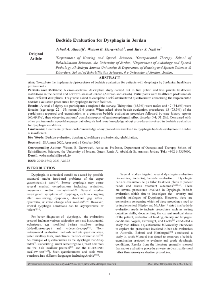 Bedside Evaluation for Dysphagia in Jordan Original ArticleJehad A. Alaraifi1, Wesak B. Darawsheh2, and Laser S. Natour3 Department of Hearing and Speech Sciences, 2Occupational Therapy, School of