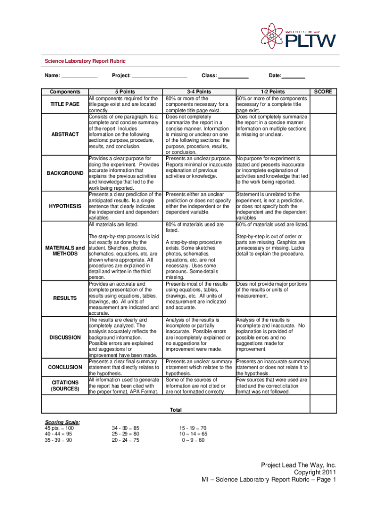 Science Laboratory Report Rubric Name: ___ Components TITLE PAGEABSTRACTBACKGROUNDHYPOTHESISProject: ___5 Points All components required for the title page exist and are located correctly. Consists