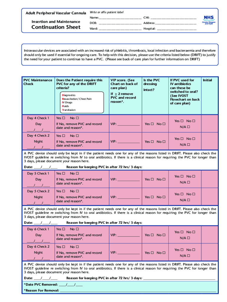 Adult Peripheral Vascular Cannulate or affix patient label Name:___ CHI:___Insertion and MaintenanceContinuation Sheet DOB: ___ Address:___ Ward: ___ Hospital:___Intravascular devices are associated