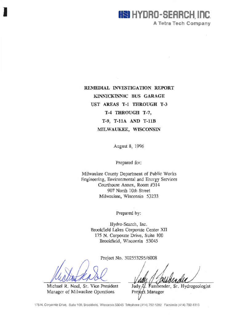 IHSI HYDROSEARCH, inc. A Tetra Tech CompanyREMEDIAL INVESTIGATION REPORT KINNICKINNIC BUS GARAGE MUST AREAS T1 THROUGH T3 T4 THROUGH T7, T9, Ella AND LLB l11LWAUKEE, WISCONSINAugust 8, 1996Prepared