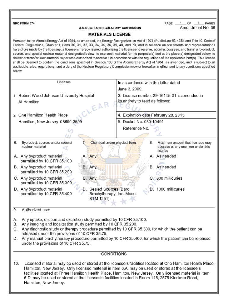 PAGE NRC FORM 3741OF4PAGESAmendment No. 36U. S. NUCLEAR REGULATORY COMMISSIONMATERIALS LICENSE Pursuant to the Atomic Energy Act of 1954, as amended, the Energy Reorganization Act of 1974 (Public