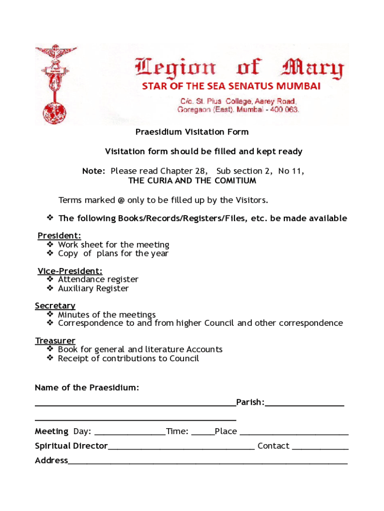 Praesidium Visitation Form should be filled and kept ready Note: Please read Chapter 28, Sub section 2, No 11, THE CURIA AND THE VOMITING Terms marked @ only to be filled up by the Visitors. The following