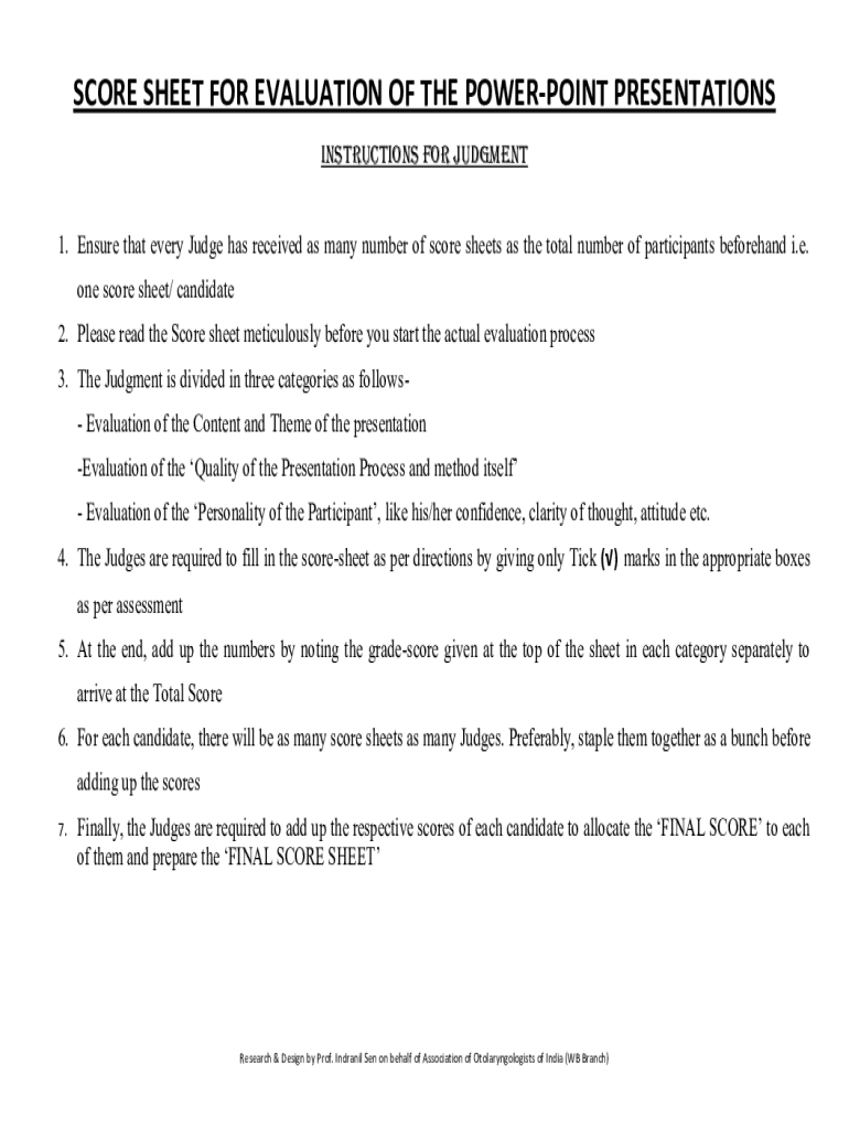 Scoresheet FOR EVALUATION OF THE PowerPoint PRESENTATIONS Instructions for Judgment 1. Ensure that every Judge has received as many number of scoresheets as the total number of participants beforehand