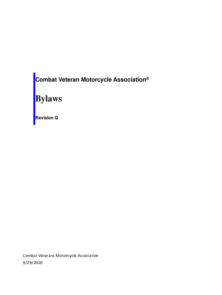 Combat Veteran Motorcycle AssociationBylaws Revision Combat Veterans Motorcycle Association 9/29/2020Table of Contents Title Page Table of Contents Article 1: Name and Emblem Article 2: Objectives