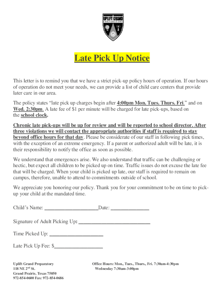 Late Pick Up Notice This letter is to remind you that we have a strict pickup policy hours of operation. If our hours of operation do not meet your needs, we can provide a list of child care centers
