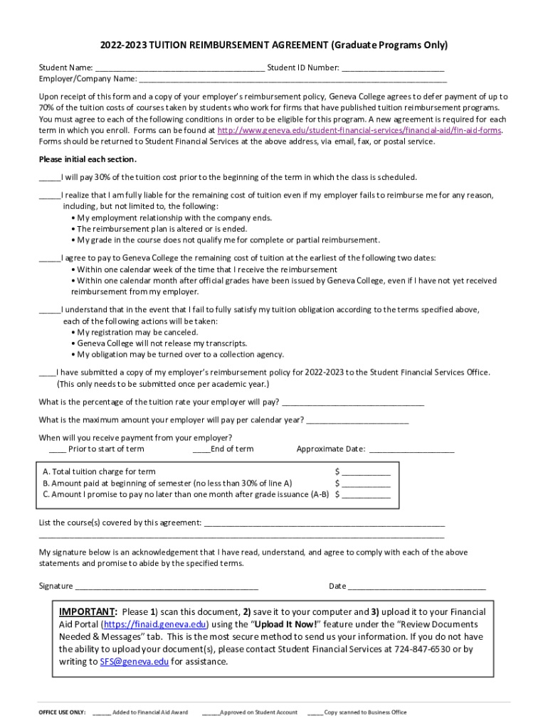 20222023 TUITION REIMBURSEMENT AGREEMENT (Graduate Programs Only) Student Name: ___ Student ID Number: ___ Employer/Company Name: ___ Upon receipt of this form and a copy of your employers reimbursement