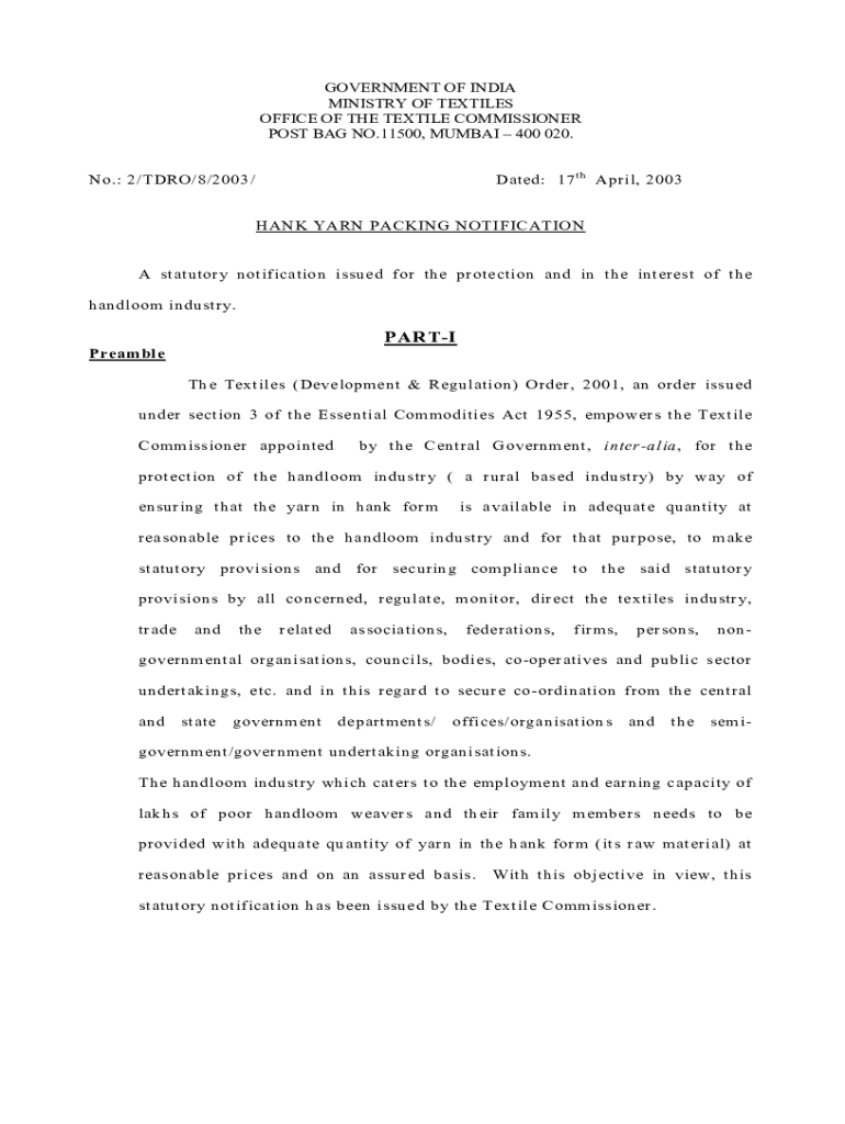 GOVERNMENT OF INDIA MINISTRY OF TEXTILES OFFICE OF THE TEXTILE COMMISSIONER POST BAG NO.11500, MUMBAI 400 020. Dated: 17th April, 2003No.: 2/TARO/8/2003/HANK YARN PACKING NOTIFICATION A statutory