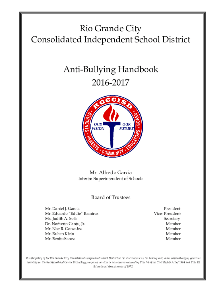 Rio Grande City Consolidated Independent School District AntiBullying Handbook 20162017Mr. Alfredo Garcia Interim Superintendent of Schoolyard of Trustees Mr. Daniel J. Garcia Mr. Eduardo Eddie Ramirez
