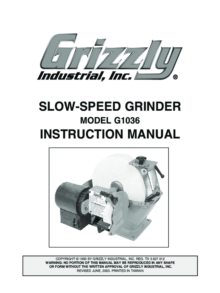 SLOWED GRINDER MODEL G1036INSTRUCTION MANUALCOPYRIGHT 1993 BY GRIZZLY INDUSTRIAL, INC. REG. TX 3 627 012 WARNING: NO PORTION OF THIS MANUAL MAY BE REPRODUCED IN ANY SHAPE OR FORM WITHOUT THE WRITTEN