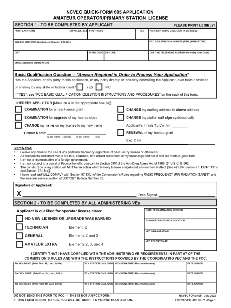 The wwwncvecorgncvec605ncvec quick-form 605 application requires personal information, information about your experience with amateur radio, and payment of fees.