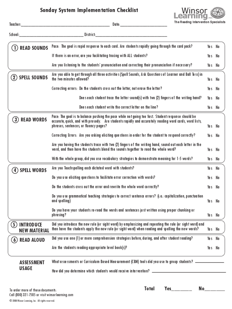 Sunday System Implementation ChecklistWinsor, INC. Teacher:___ Date:___The Reading Intervention SpecialistsSchool:___ District:___1 READ SOUNDS Pace: The goal is rapid response to each card. Are students