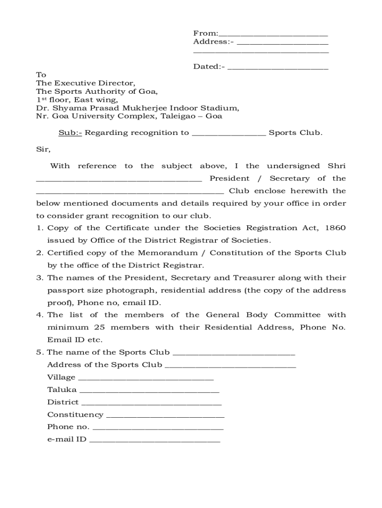 From:___ Address: ___ ___ Dated: ___ To The Executive Director, The Sports Authority of Goa, 1st floor, East wing, Dr. Shame Prasad Mukherjee Indoor Stadium, NR. Goa University Complex, Malaga Goa