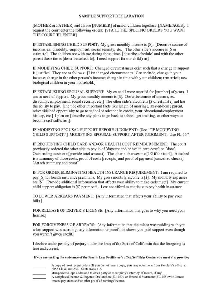 SAMPLE SUPPORT DECLARATION [MOTHER or FATHER] and I have [NUMBER] of minor children together: [NAME/AGES]. I request the court enter the following orders: [STATE THE SPECIFIC ORDERS YOU WANT THE COURT