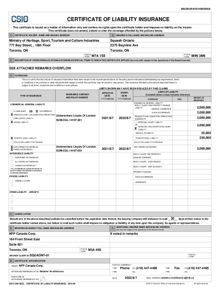 ANUSHARAVICHANDRANCERTIFICATE OF LIABILITY INSURANCE This certificate is issued as a matter of information only and confers no rights upon the certificate holder and imposes no liability on the insurer.