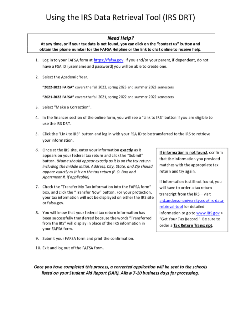 Using the IRS Data Retrieval Tool (IRS DRT) Need Help? At any time, or if your tax data is not found, you can click on the contact us button and obtain the phone number for the FAFSA Helpline or the