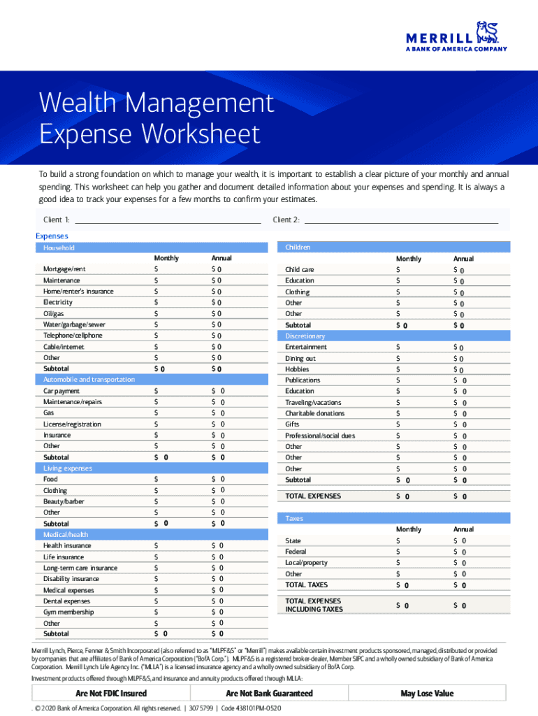 Wealth Management Expense Worksheet To build a strong foundation on which to manage your wealth, it is important to establish a clear picture of your monthly and annual spending. This worksheet can