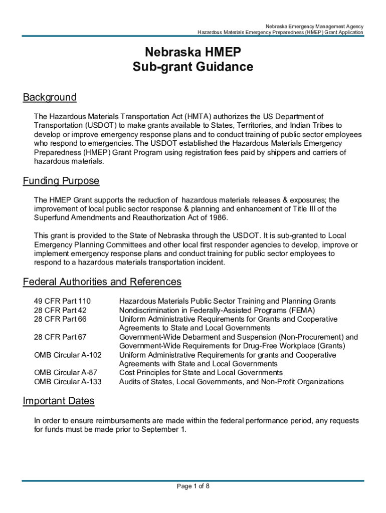 State agencies, local governments, and other eligible entities that receive HMEP funding in Nebraska are required to file nebraska hmep sub-grant guidance.