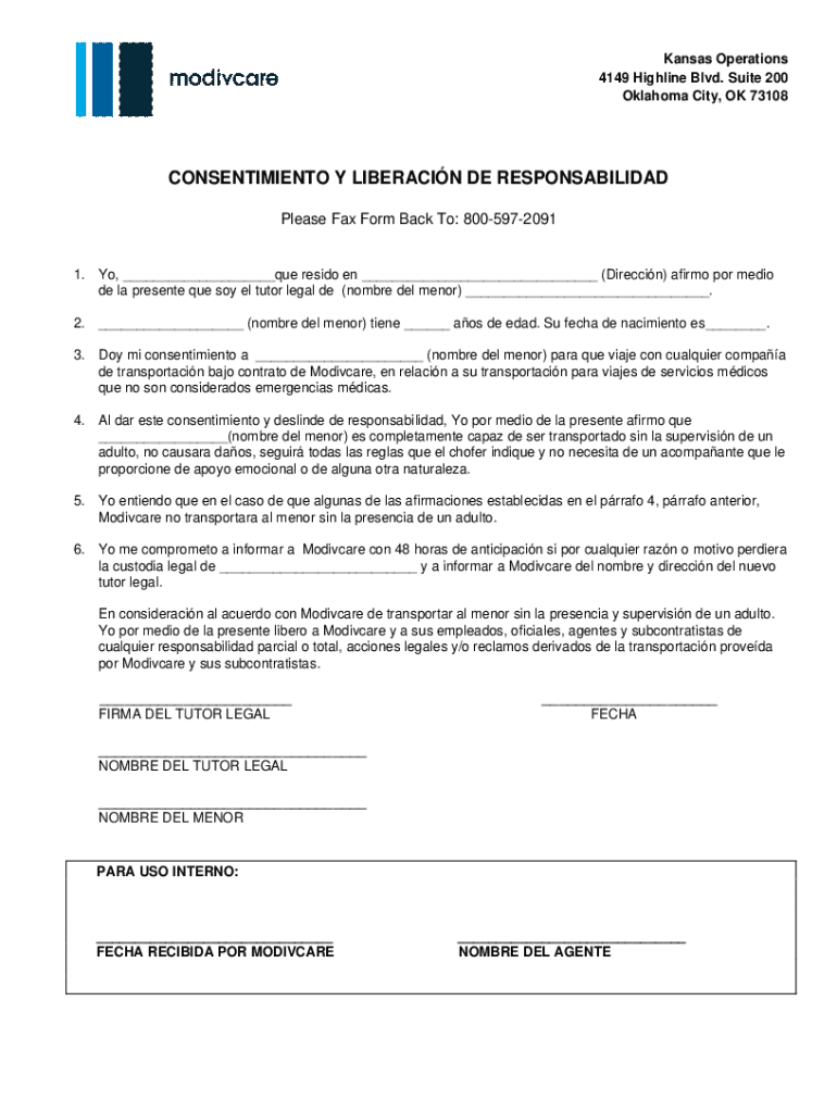 Kansas Operations 4149 High line Blvd. Suite 200 Oklahoma City, OK 73108CONSENTIMIENTO Y LIBERATION DE RESPONSABILIDAD Please Fax Form Back To: 80059720911. Yo, ___Que reside en ___ (Direction) firm