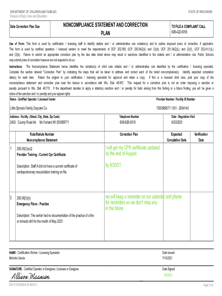 DEPARTMENT OF CHILDREN AND FAMILIES Division of Early Care and Educational Correction Plan Estate OF WISCONSINNONCOMPLIANCE STATEMENT AND CORRECTION PLANT FILE A COMPLAINT CALL 6084226765Use of Form: