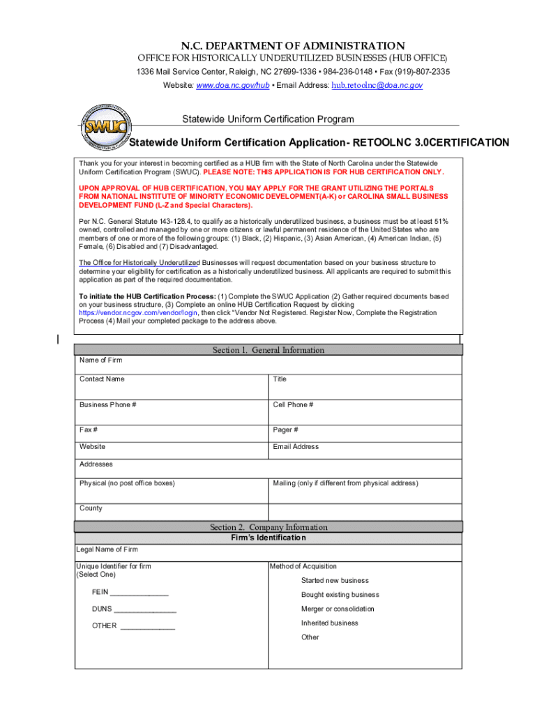 N.C. DEPARTMENT OF ADMINISTRATIONOFFICE FOR HISTORICALLY UNDERUTILIZED BUSINESSES (HUB OFFICE) 1336 Mail Service Center, Raleigh, NC 276991336 9842360148 Fax (919)8072335 Website: www.doa.nc.gov/hub