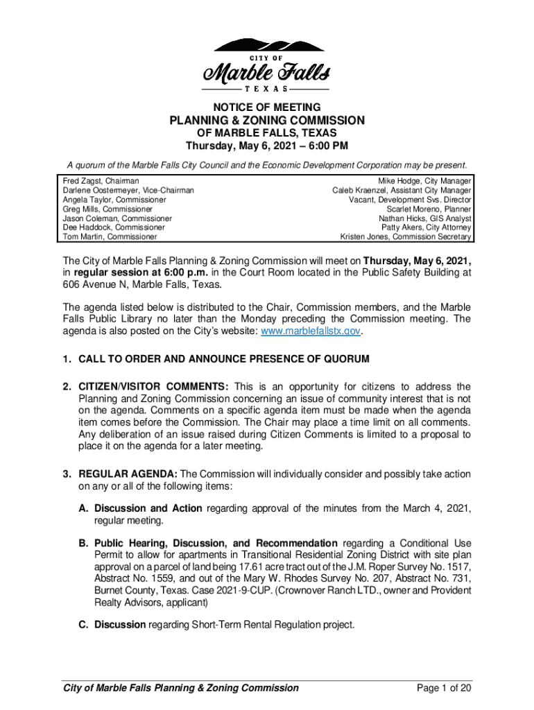 NOTICE OF MEETINGPLANNING & ZONING COMMISSION OF MARBLE FALLS, TEXAS Thursday, May 6, 2021 6:00 PM A quorum of the Marble Falls City Council and the Economic Development Corporation may be present.
