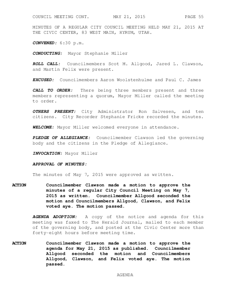 COUNCIL MEETING CONT.MAY 21, 2015PAGE 55MINUTES OF A REGULAR CITY COUNCIL MEETING HELD MAY 21, 2015, AT THE CIVIC CENTER, 83 WEST MAIN, DRUM, UTAH. CONVENED: 6:30 p.m. CONDUCTING:Mayor Stephanie MillerROLL
