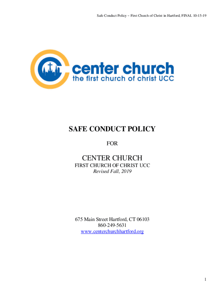 Safe Conduct Policy First Church of Christ in Hartford, FINAL 101519SAFE CONDUCT POLICY WORCESTER CHURCH FIRST CHURCH OF CHRIST UCC Revised Fall, 2019675 Main Street Hartford, CT 06103 8602495631