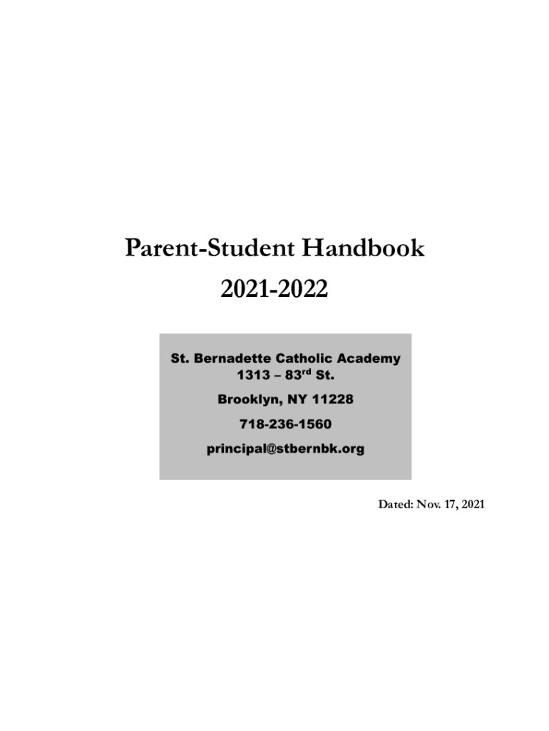 ParentStudent Handbook 20212022Dated: Nov. 17, 2021St. Bernadette Catholic Academy 1313 83rd Street, Brooklyn, New York 11228___Tel. 7182361560Fax 7182363364 principal@stbernbk.org www.stbernbk.orgWELCOME