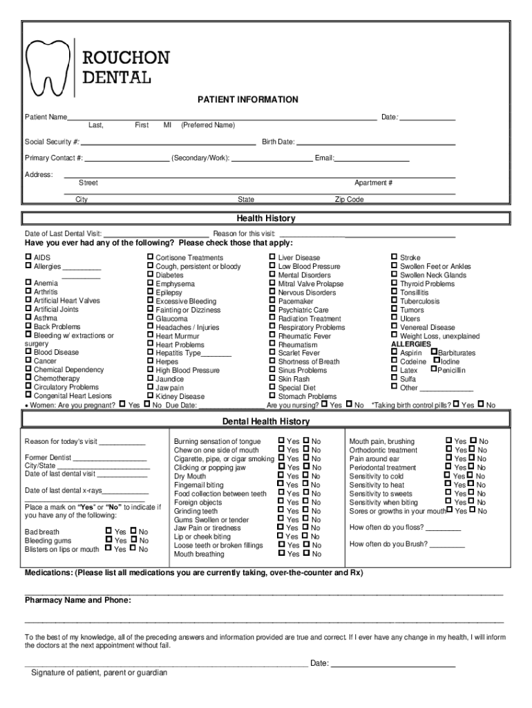 PATIENT INFORMATION Patient Name Date: Last, First MI(Preferred Name)Social Security #:Birth Date:Primary Contact #: ___ (Secondary/Work): ___ Email: ___ Address: StreetApartment #CityStateZip Telehealth