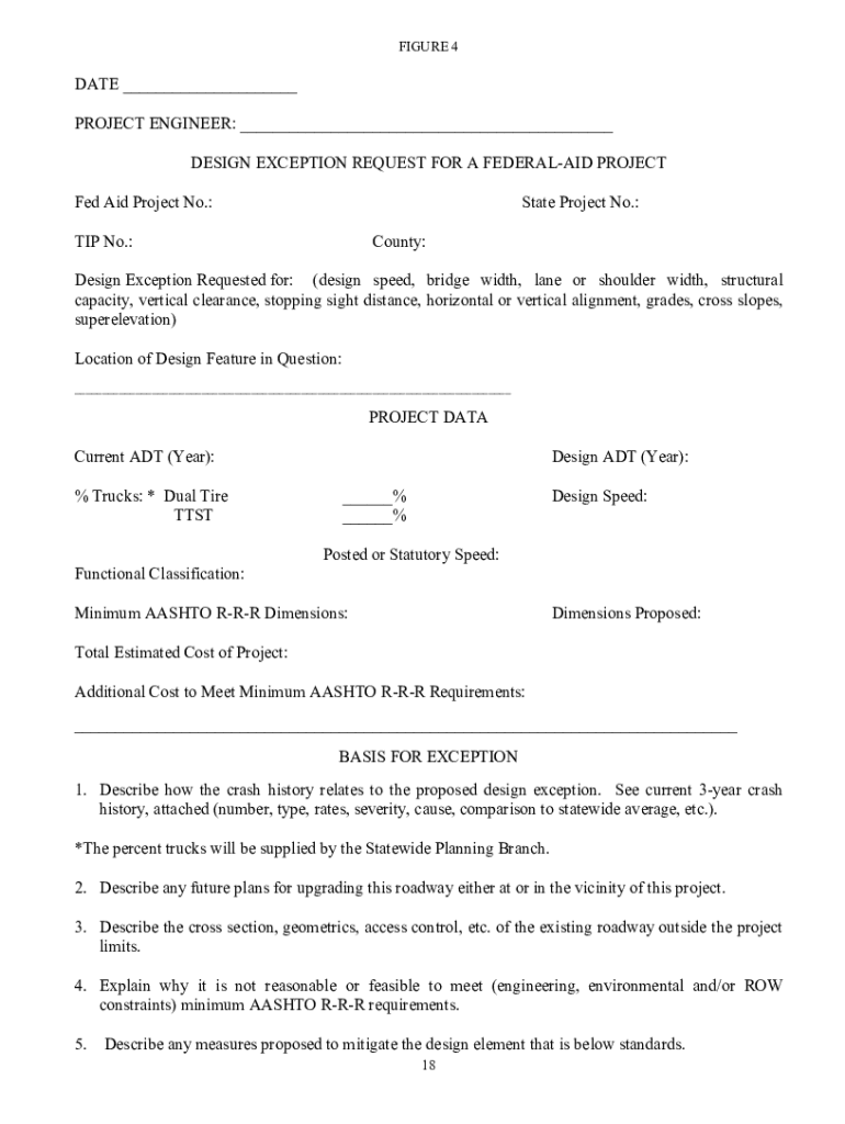 FIGURE 4DATE ___ PROJECT ENGINEER: ___ DESIGN EXCEPTION REQUEST FOR A FEDERAL AID PROJECT Fed Aid Project No.:State Project No.:TIP No.:County:Design Exception Requested for: (design speed, bridge
