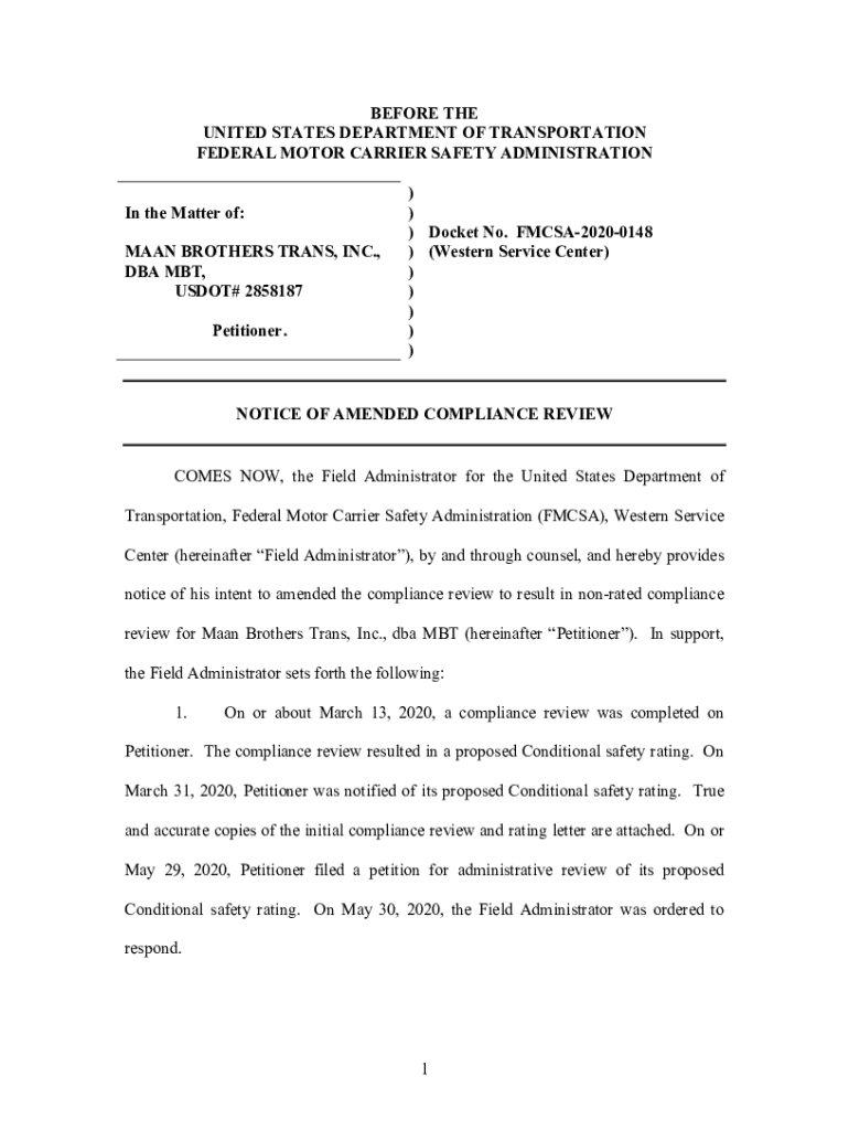 BEFORE THE UNITED STATES DEPARTMENT OF TRANSPORTATION FEDERAL MOTOR CARRIER SAFETY ADMINISTRATION In the Matter of: MAIN BROTHERS TRANS, INC., DBA MBT, US DOT# 2858187 Petitioner.) )) Docket No. FMCSA20200148)
