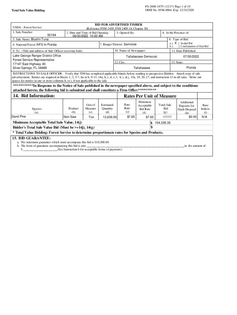 FS240014TV (12/17) Page 1 of 10 OMB No. 05960066 Exp. 12/31/2020Total Sale Value Bidding USDA Forest Service 1. Sale Number:50194 5. Sale Name: Blue fin Tuna BID FOR ADVERTISED TIMBER (Reference FSM