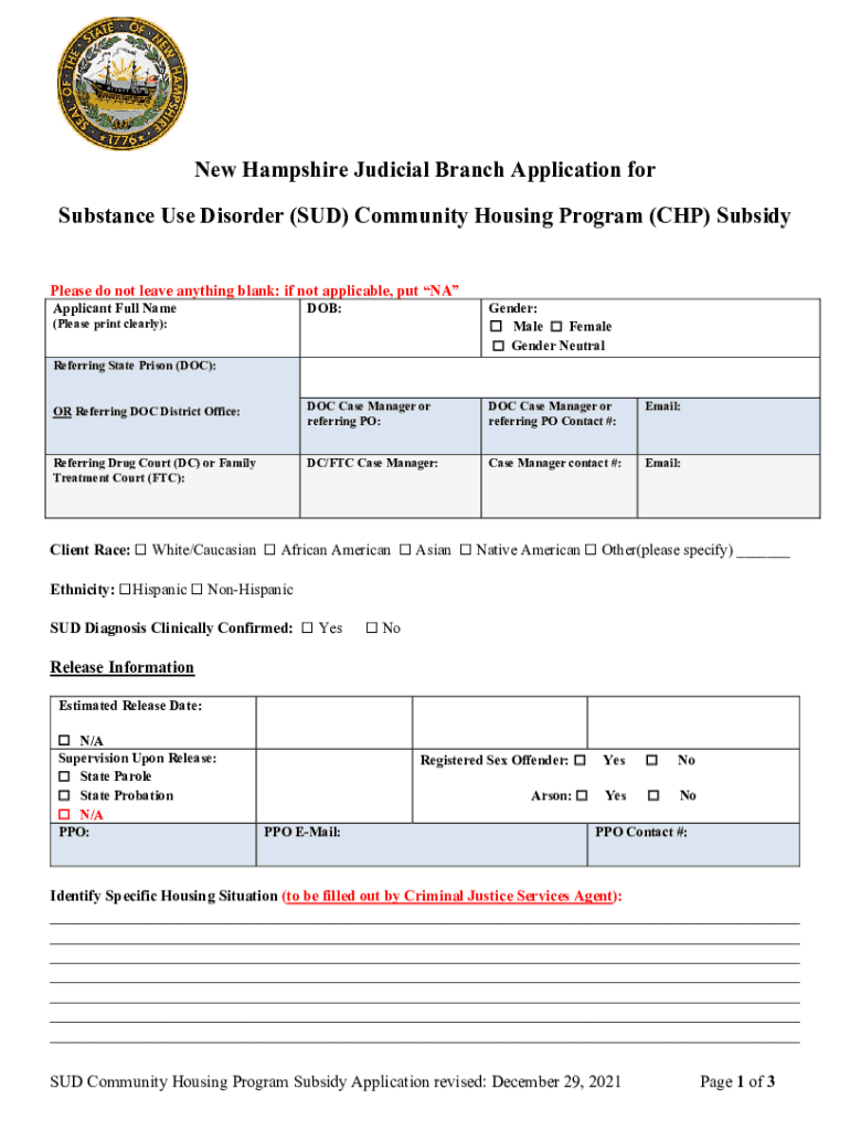 New Hampshire Judicial Branch Application for Substance Use Disorder (SUD) Community Housing Program (CHP) Subsidy Please do not leave anything blank: if not applicable, put NA Applicant Full Name
