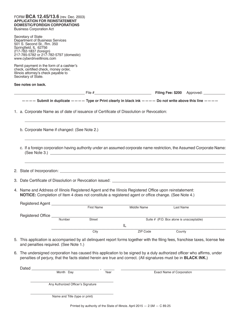 Print Reset Save FORM BCA 12.45/13.6 (rev. Dec. 2003) APPLICATION FOR REINSTATEMENT DOMESTIC/FOREIGN CORPORATIONS Business Corporation Act Secretary of State Department of Business Services 501 S.