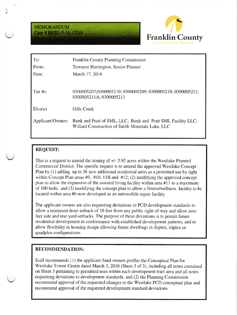 MEMORANDUM #XEZO3J6152UGaEeFranklin County:Franklin County Planning Commissioner:Terrance Harrington, Senior PlannerDate:March 17,2016Tax #s:03 00005 207 ;O30OOO 52 1 0 ; 030000 5209 ; 0300005 2 I