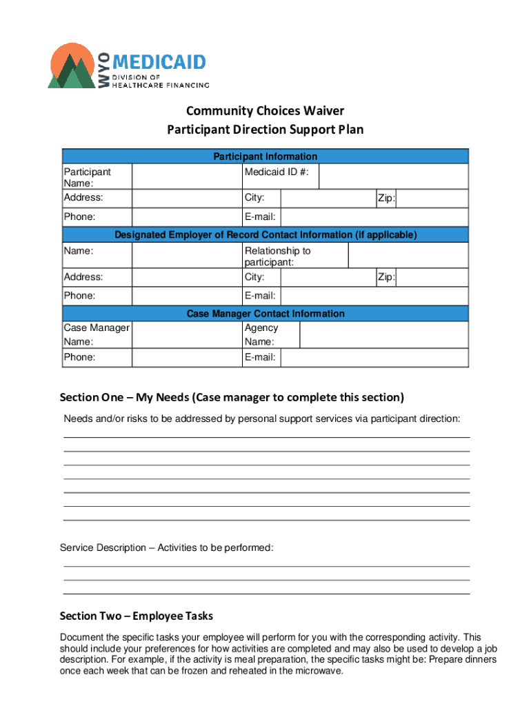 Community Choices Waiver Participant Direction Support Plan Participant Information Participant Name: Address:Medicaid ID #:Phone:Email:City:Zip:Designated Employer of Record Contact Information (if