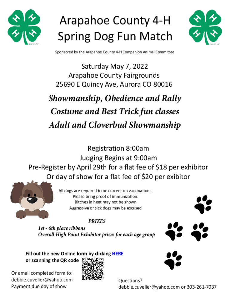 Arapahoe County 4H Spring Dog Fun Match Sponsored by the Arapahoe County 4H Companion Animal Commit Saturday, May 7, 2022, Arapahoe County Fairgrounds 25690 E Quincy Ave, Aurora CO 80016Showmanship,