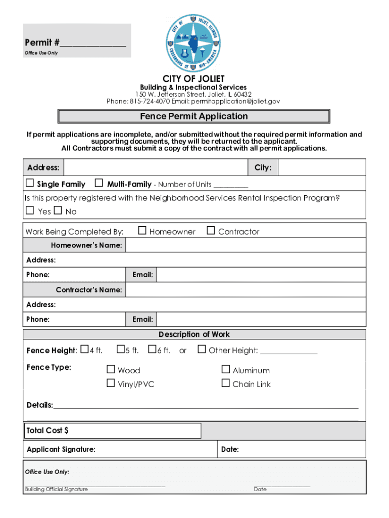 Permit #___ Office Use Velocity OF JOLIETBuilding & Inspection Services150 W. Jefferson Street, Joliet, IL 60432 Phone: 8157244070 Email: permitapplication@joliet.govFence Permit Application If permit