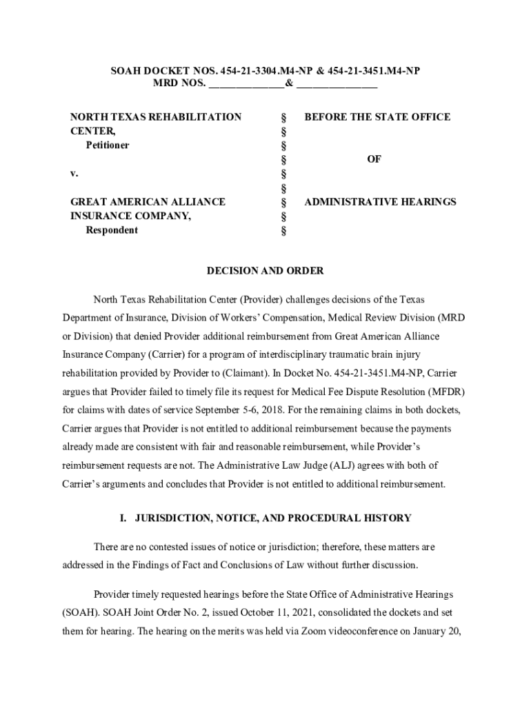 SOAP DOCKET NOS. 454213304. M4NP & 454213451. M4NP MID NOS. ___& ___ NORTH TEXAS REHABILITATION CENTER, Petitioner v. GREAT AMERICAN ALLIANCE INSURANCE COMPANY, Respondent BEFORE THE STATE OFFICEOFADMINISTRATIVE